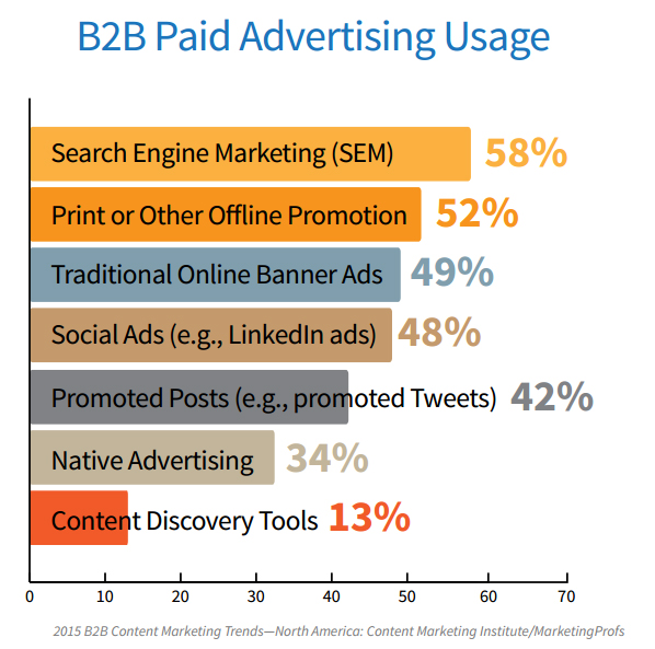 The B2C Content Marketing 2015: Benchmarks, Budgets, and Trends—North America gives us insight into how a majority of marketers are distributing content marketing through paid advertising methods.