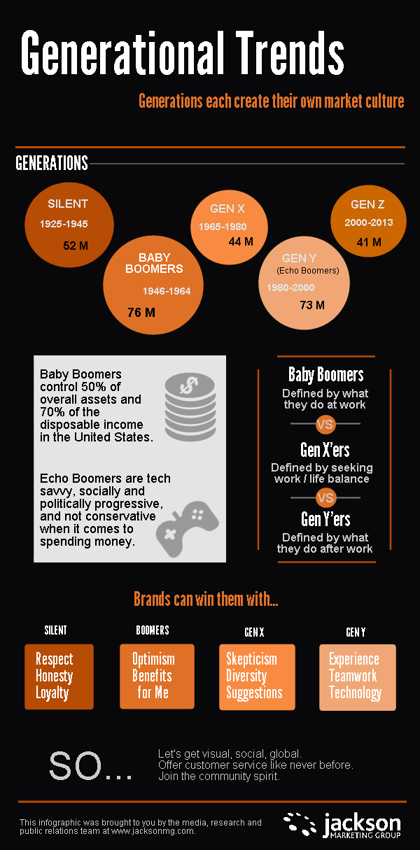 Although 6 generations are alive today, we focus our infographic around 5 generations – 4 of which are in the workforce and have buying power.